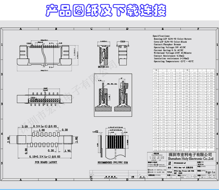 我司主要生產家電連接器,SMT貼片FPC連接器,產品規格從0.3mm、 0.5mm 、1.0mm 、1.25mm、 1.5mm 、2.0MM、2.5mm間距連接器,(FPC排插),板對板 0.5mm 、0.8mm 間距連接器,共四十余種產品,上千種孔位,產品質量無飛邊,無毛刺,全部新料注塑,符合歐盟環保,孔位齊全,尺寸穩定,容易搭配,產品價格合理,如貴司有需要,可以隨時聯系我們,真誠希望能和貴司有合作的機會,http://rigolu.cn.alibaba.com進入公司網址,點擊左側間距目錄可快速精確尋找貴司需要的產品。